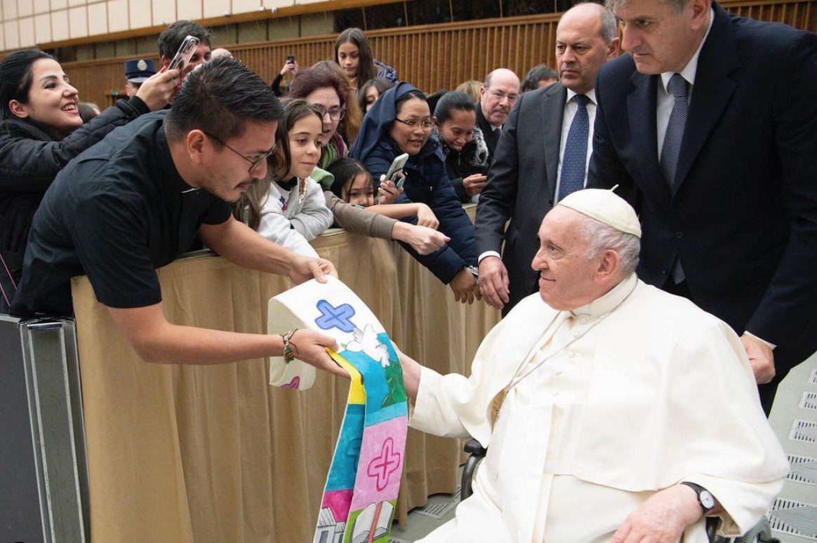 Gracias a un viaje a Italia de su congregación, Jonathan pudo entregarle al Papa Francisco dos obsequios en nombre de Murales por la Paz y del Movimiento Laudato Si’: la pintura “La Iglesia con rostro Amazónico”, del pintor Juan Camilo Herrera y una estola pintada por Cristian Camargo.