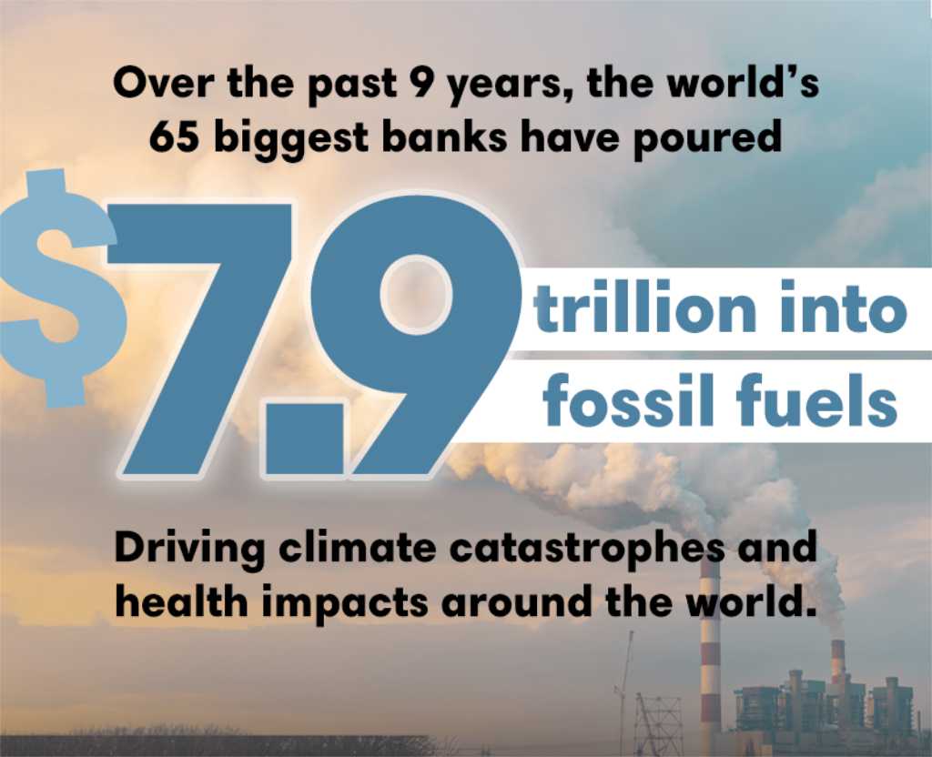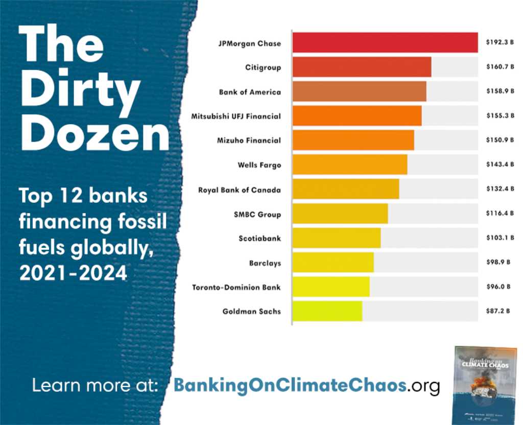 JP Morgan Chase (53 500 millones de dólares) fue el mayor financiador de combustibles fósiles del mundo en 2024, seguido por Bank of America (46 000 millones de dólares) y Citigroup (44 700 millones de dólares). Barclays fue el mayor financiador de combustibles fósiles de Europa (35 400 millones de dólares), aumentando la financiación de combustibles fósiles en más de un 50 % en 2024.