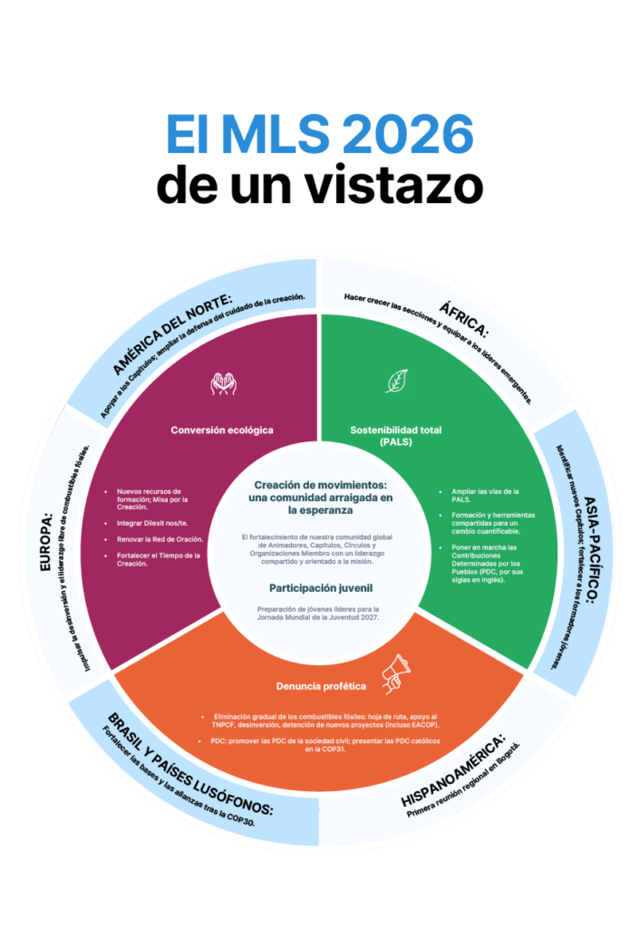 África – Ampliar los Capítulos dinámicos, formar a los líderes ecológicos emergentes y fomentar la colaboración para promover soluciones basadas en la experiencia de la comunidad. Asia-Pacífico – Llevar a cabo un discernimiento estructurado para identificar nuevos Capítulos y fortalecer las redes de jóvenes formadores y facilitadores. América del Norte – Apoyar a los capítulos nuevos y existentes y profundizar en una campaña compartida para fortalecer la voz de la Iglesia en favor del cuidado de la creación. Europa – Promover la desinversión y las soluciones libres de combustibles fósiles, movilizar a los socios para impulsar el liderazgo climático de la UE y ampliar el alcance de Laudato Si’ a nuevos grupos católicos a través de recursos como Dilexit nos y Dilexit te. América Hispánica – Organizar la primera Reunión Hispanoamericana del Movimiento Laudato Si’ en Bogotá (2026), dinamizando la conversión ecológica regional. Brasil y regiones lusófonas – aprovechar el impulso de Brindar Esperanza y la COP30 para fortalecer las bases, profundizar las alianzas con la Iglesia y ampliar la participación del gobierno, especialmente en este año electoral.
