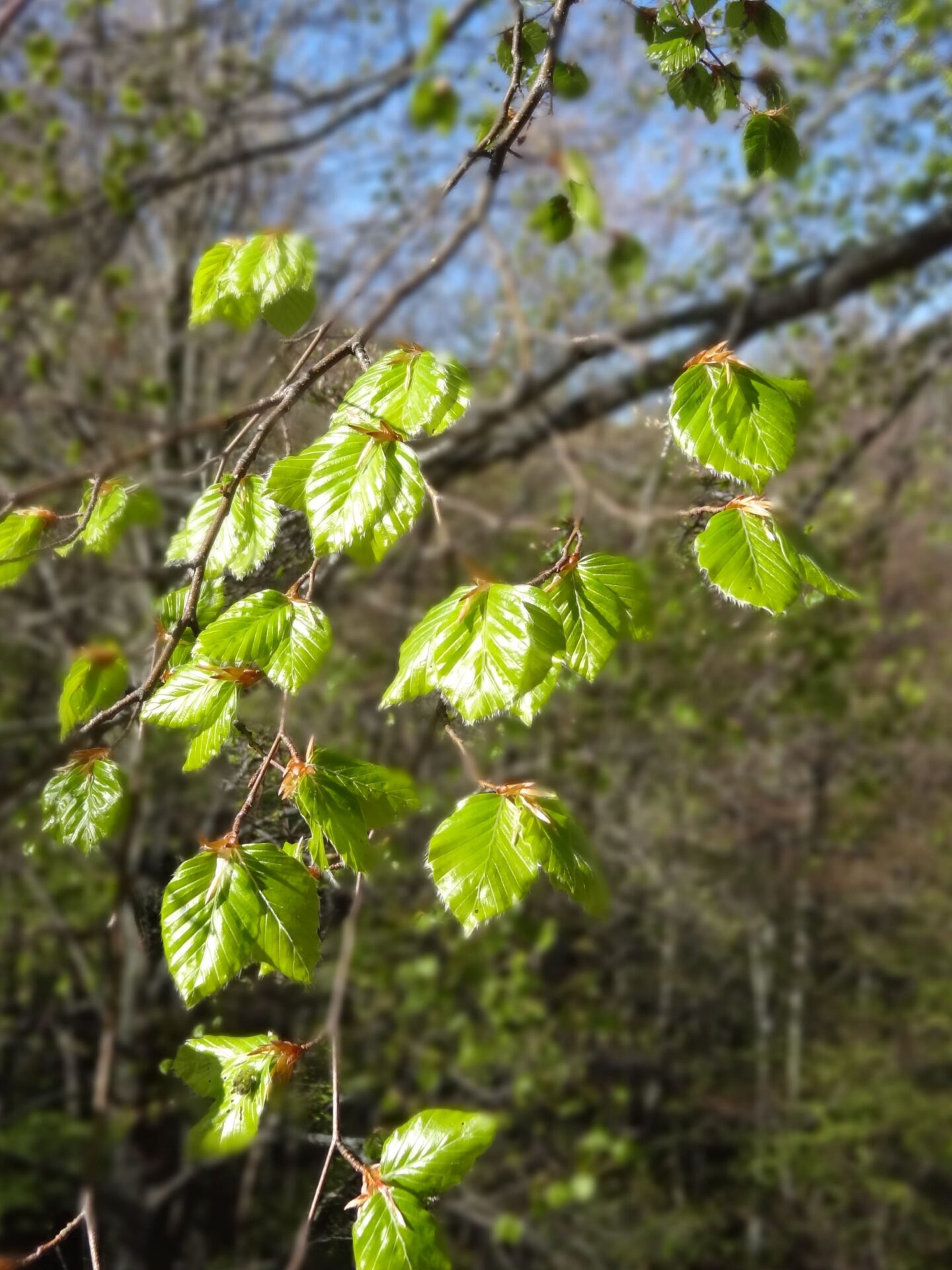 Premières feuilles de hêtre au printemps dans le parc de la maison Saint-Joseph à Allex (Drôme). La beauté de la Création resplendit aussi dans les toutes petites choses, là où la vie jaillit. (Photo de frère Mathieu Boulanger)