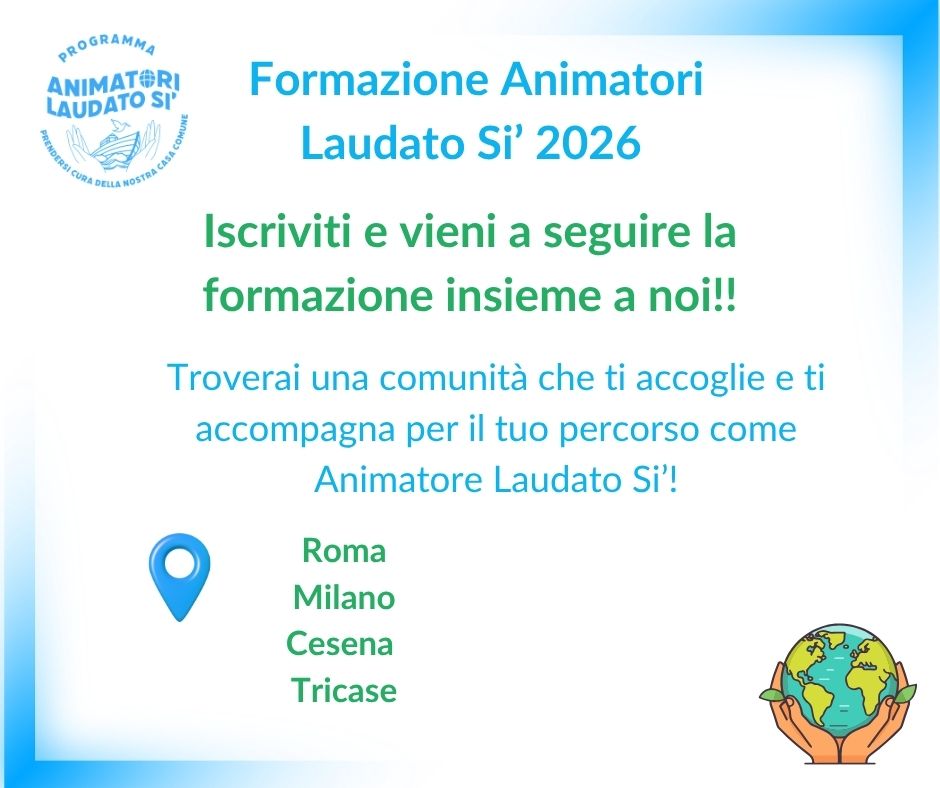 👉 Consulta il programma del nuovo corso che inizierà mercoledì 15 aprile e si terrà online per quattro settimane il mercoledì dalle 18.00 alle 19.45 in diretta per respirare insieme già dal corso un forte senso di comunità nella diversità delle appartenenze e provenienze ma ci sarà comunque la possibilità di seguirlo anche in differita. La novità di quest’anno è che per la prima volta si potrà seguire anche insieme ai Circoli Laudato Si’ che decideranno di ospitare delle proiezioni comunitarie del corso per creare sin dal primo momento un clima di accoglienza e accompagnamento per i nuovi Animatori in formazione. Al momento ci saranno proiezioni comunitarie a Roma itineranti grazie a Piera Savino del Circolo Laudato Si’ Roma Trastevere e la collaborazione con altre realtà del territorio;  Milano grazie ad Agostino Cullati e alla collaborazione con le ACLI Milanesi; a Cesena e a Tricase grazie a Stefano Masini e Oriana Leone e ai rispettivi Circoli Laudato Si’. Seguite i nostri canali social per rimanere aggiornati sulle altre proiezioni comunitarie.