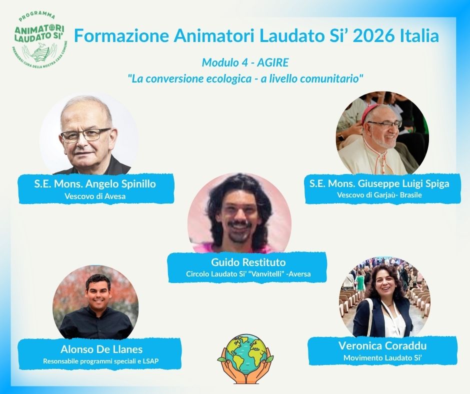 Nell’incontro successivo del 6 maggio di Mons. Angelo Spinillo, Vescovo di Aversa dove forte è l’impegno nella Chiesa da parte dei giovani, come testimoniato dai ragazzi del Circolo Laudato Si’ Vanvitelli di Aversa che saranno con lui. Proseguirà poi con la testimonianza di Mons. Giuseppe Luigi Spiga, Vescovo di Grajaù e missionario fidei donum in Brasile, uno sguardo sull’importanza della cura della casa comune per i popoli dell’Amazzonia e di come le popolazioni indigene possano essere maestre di comunità. Particolare attenzione verrà data in questo modulo alla Piattaforma di Iniziative Laudato Si’ del Dicastero per il Servizio dello Sviluppo Umano Integrale del Vaticano che verrà presentata come una guida molto utile per la conversione comunitaria.
