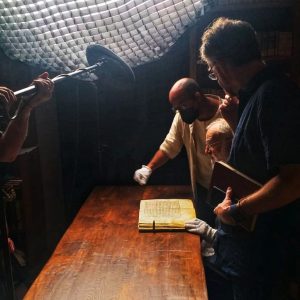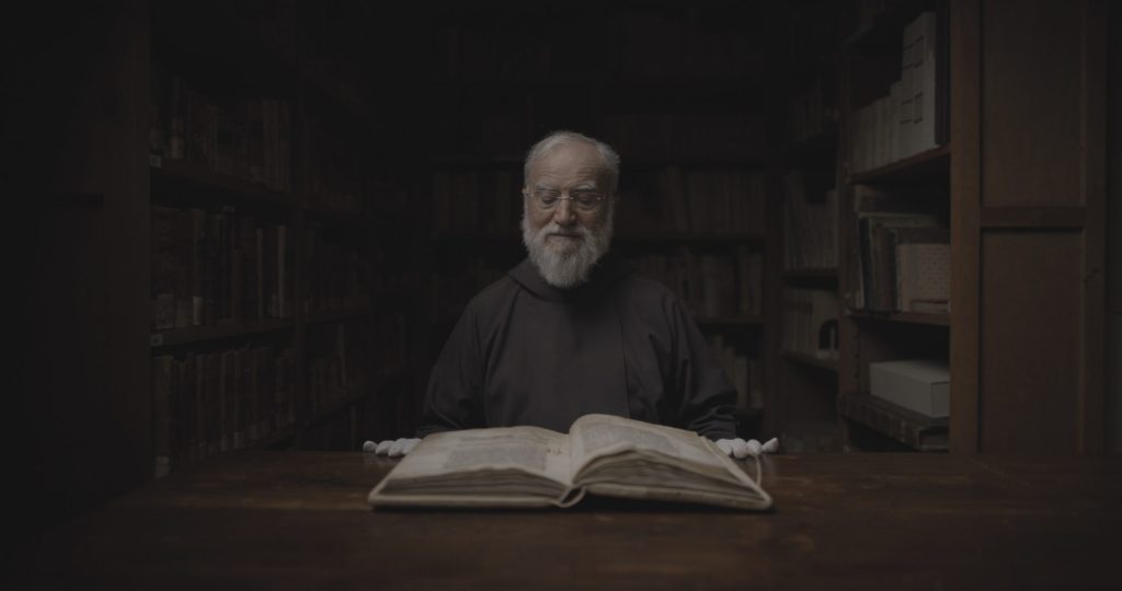 Durante quegli intensi giorni di riprese, mi ha particolarmente commosso un’inquadratura che Tomás ha realizzato al Cardinale Cantalamessa mentre eravamo davanti al Codice 338, conservato presso il Sacro Convento di Assisi e sede del Cantico delle Creature di San Francesco.
