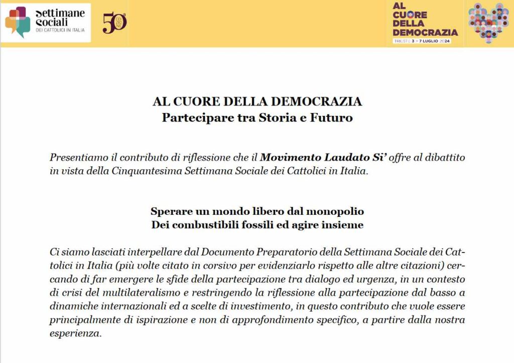 In vista della Settimana Sociale, il Movimento ha offerto al dibattito un contributo di riflessione dal titolo “Sperare un mondo libero dal monopolio dei combustibili fossili ed agire insieme”. Ci siamo lasciati interpellare dal Documento Preparatorio della Settimana Sociale cercando di far emergere le sfide della partecipazione tra dialogo ed urgenza, in un contesto di crisi del multilateralismo e restringendo la riflessione alla partecipazione dal basso a dinamiche internazionali ed a scelte di investimento, per offrire un contributo principalmente di ispirazione e non di approfondimento specifico, a partire dalla nostra esperienza. Tra le varie idee e proposte anche quella di un Trattato di Non Proliferazione dei Combustibili Fossili per cercare un equilibrio tra urgenza e trasformazione duratura, confidando nella guida di Dio. Questo strumento della società civile globale può aiutarci a generare un cambiamento trasformativo a lungo termine e, allo stesso tempo, a garantirne l’attuazione immediata.