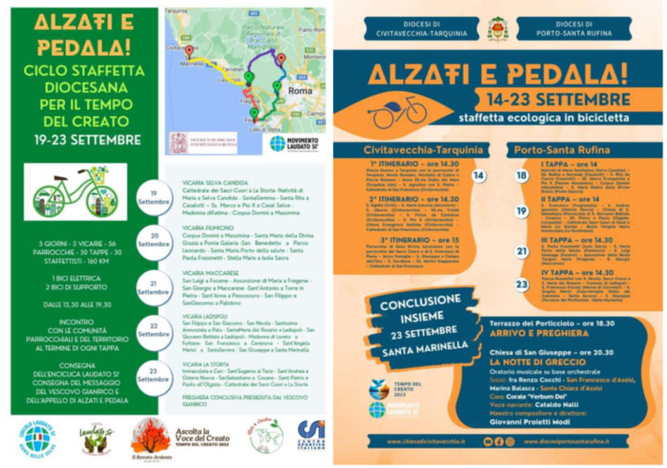 Alzati&Pedala” si è svolta per due anni consecutivi nei mesi di settembre 2022 e 2023 (Tempo del Creato), per sensibilizzare parrocchie, cittadini e comunità intere sull’importanza della Cura del Creato. E’ un’iniziativa entrata nella tradizione delle due diocesi coinvolte; è una ciclo-staffetta ecologica che nel 2022 ha percorso tutto il territorio della diocesi di Porto Santa Rufina e nel 2023 anche quello della diocesi sorella di Civitavecchia Tarquinia, per portare a tutti il messaggio dell’Enciclica Laudato Si’ (2022) e della Fratelli tutti (2023).